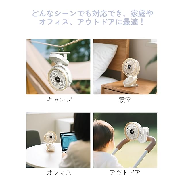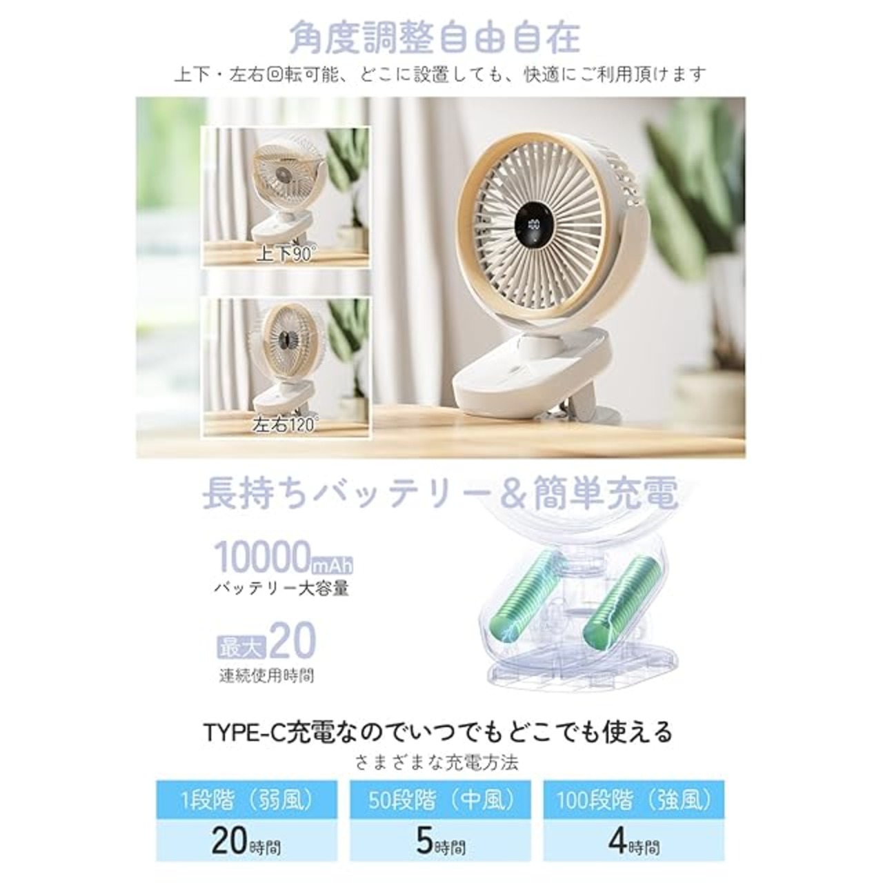 ✅【無段階風量调節&12H連続稼働】 クリップで様々な場所に取り付けられる利便性と、無段階の風量調節、そして12時間という長時間の連続稼働能力が組み合わさることで、より多くのシーンで「快適な涼しさを持続させる」ことが可能になります。クリップで固定すれば、多少の振動があっても安定して風を送れますし、長時間稼働のおかげで移動先でも電池切れの心配が少ないです。