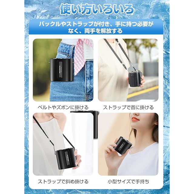 【ハンズフリーで自由自在】:手に持つだけでなく、ベルトに挟んだり、付属のストラップで首に掛けることもできます。両手が自由になるため、屋外での作業やキャンプなど、さまざまなシーンで快適に使用できます。