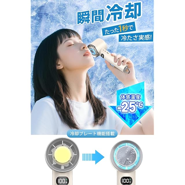 【2025年新登場 わずか1秒で肌に冷感。先進のハンディファン 冷感プレート搭載】最新の冷却技術を応用した「ハンディファン 冷感プレート」は、電源を入れてから1秒で肌表面を瞬間冷却。直接肌に触れるアルミプレートが体温を効率的に吸収し、従来のハンディファンでは得られなかった体感温度の低下を実現。真夏の屋外、満員電車、オフィスでも快適な時間を確保します。