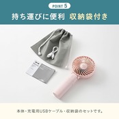 連続使用時間:約2.5~8時間、風量3段階切替(弱/中/強)、手持・卓上兼用型、モバイルバッテリー(2,200mAh)