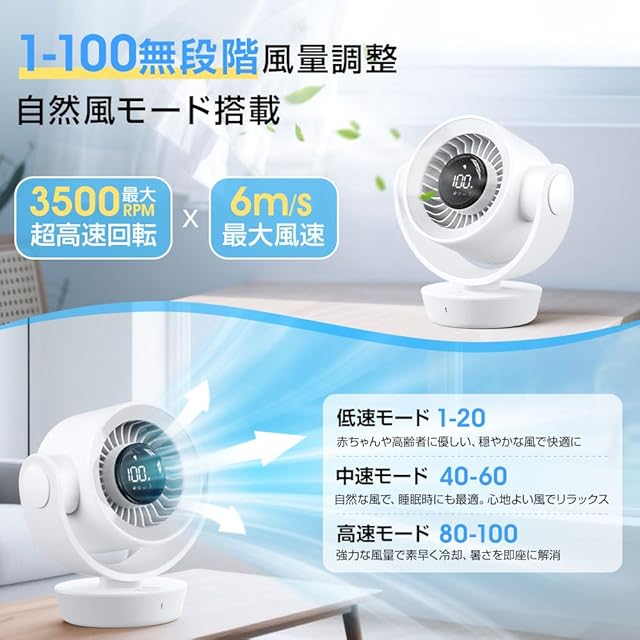 【極静音DCモーター|100段階風量調節】静音性に優れた DCモーター 搭載の サーキュレーター は、図書館レベルの静けさを誇ります。静かな 扇風機 小型 タイプとして、赤ちゃんや寝室、オフィスでも安心して使えます。100段階の風量調節が可能な コードレス扇風機 として、パワフルな送風から優しい微風まで調整自在です。卓上扇風機 静音タイプをお探しの方にぴったりの サーキュレーター 静音 モデルです。