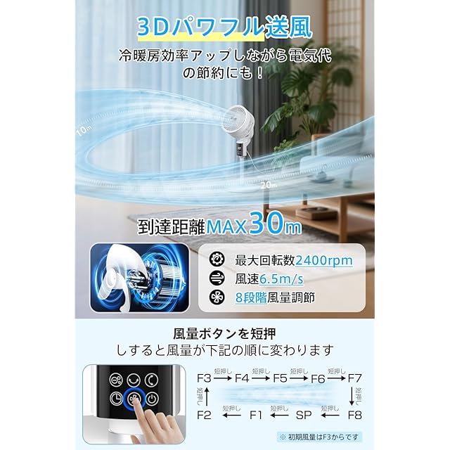 【8段階風量&&全方位首振りで快適気流を提供】微風から強風まで8段階の風量調節が可能で、広いリビングでも効率的な空気循環を実現。最大風力モードでは部屋干し中の洗濯物に直接風を当てたり、仕切りを挟んだ隣室まで空気を届けることができます。特に部屋全体の気流改善が必要な場合は、上下独立可動式の3D首振り機能を活用。上部の温熱空気と下部の冷涼空気を効率的に撹拌し、室温を均一に保つことで快適な空間作りをサポートします。