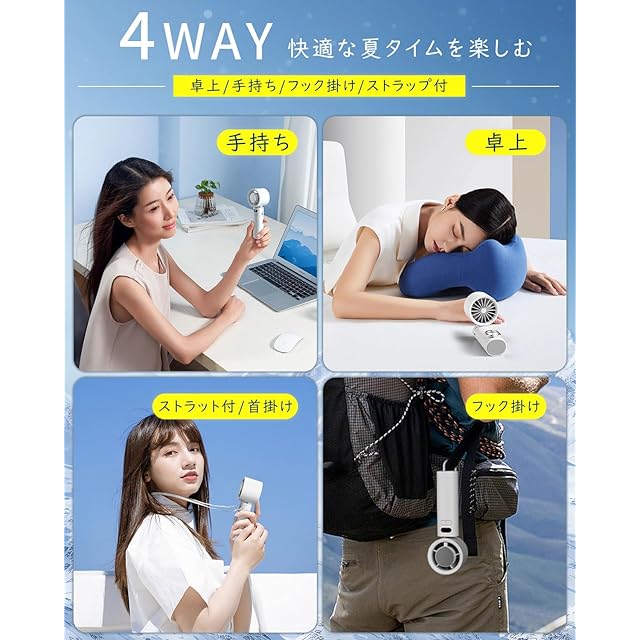 【4in1携帯扇風機&折り畳み式】一台多役の小型扇風機として、手持ち、卓上用、首掛け、腰掛などのシーンで使えます。ファン は90度まで折りたたむことができ、直接折りたたんで卓上扇風機 に変身できます、テレワークや勉強中にも涼しい風が楽しめます。ハンディ扇風機本体にはストラップ取り付け穴が装備されており、高級ストラップが付属しており、長さを自由に調節でき、両手が解放するため、長時間着用しても非常に快適です。通勤通学、ショッピング、散歩、スポーツ観戦、花火大会、お祭り、野外のイベント、フェス、キャンプ、旅行、テレワークなど、室内外問わず、幅広く活躍できるミニファンです!