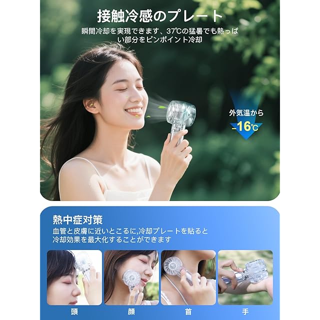 【1秒でひんやり!冷却機能搭載で暑さを瞬時に解消】この2025年新登場の冷却プレート付き扇風機は、氷のような触感を実現します。 送風中にボタンを長押しする、手持ち扇風機の真ん中にある冷却板が瞬時に作動し、小型扇風機の冷却板を頬や首、腕などに当てることで,肌表面温度を外気温から最大16℃も下げ、ほてった顔を素早くクールダウン。熱中症対策にも役立ちます。冷却グッズとして活用できるため、アウトドア活動やスポーツの際にも重宝します。