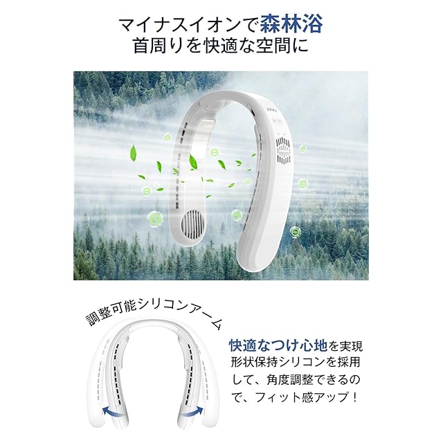 【 マイナスイオン空気浄化・新感覚ネッククーラー 】涼しい風に乗せて、約120万のマイナスイオンを放出することで、顔の周囲を取り巻き、爽快な”森林浴”気分を味わえます。また、放出されたマイナスイオンによって、空気を浄化し、周囲に漂う微細な有害物質や汗のにおいなども抑えるので、夏の暑い日でも快適に過ごすことができます。本体の高温化も防ぐため、 ✅大事な放熱システムも進化し、35個の放熱穴を備えてより効率な放熱ができ、エネルギー損失を減らします。