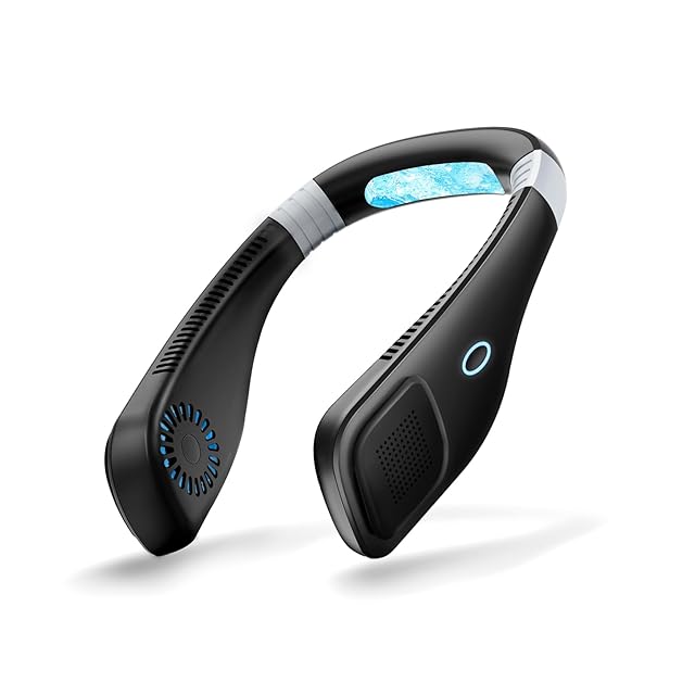 【羽根なし扇風機 三段階風量調節】このネッククーラーは羽根がないため、髪の毛が巻き込まれる心配や怪我のリスクがありません。スイッチの長押しでONとOFFの切り替えができ、スイッチを押すごとに風量を3段階から選べます。炎天下の屋外では「強」、室内では「中」、冷房の効いた部屋では「弱」と、使用シーンに合わせて風量を調節できるので非常に便利です。安全性と使いやすさを兼ね備えた設計が特徴です。