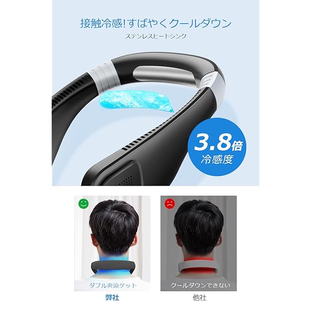 【急速冷却 首掛けクーラー】首の後ろには接触冷感ステンレスヒートシンクが付いており、涼しさを感じることができます。注意点として、このステンレス板は電気的な冷却機能はありませんが、首元を快適に保つのに役立ちます。熱中症や暑さによる立ちくらみに注意が必要な夏場でも、手軽に涼しさを得られるアイテムです。夏の必需品として、日常の様々なシーンで活躍すること間違いなしです。