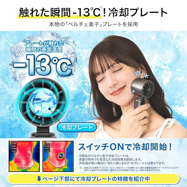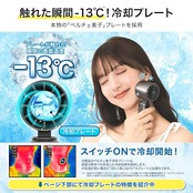 【風力調整】風量は4段階で調整可能。1段階目でも一般的なハンディファンの最大風速以上の5.0m/s、最大風速は11.5m/sです。強い風が遠くまで届き、野外など暑い環境でも十分に冷却を実感できます。【本物のペルチェ素子冷却プレートを採用】冷却プレートを限界まで外側に突き出した「でっぱり仕様」により、ファン本体が肌に触れるのを防ぎ、冷やしたい部分にピタッと当てやすい設計に。効率的にしっかり冷却できます。プレートが触れた瞬間の皮膚表面温度は-13℃を記録。猛暑の野外でも安定した冷却効果を提供します。
