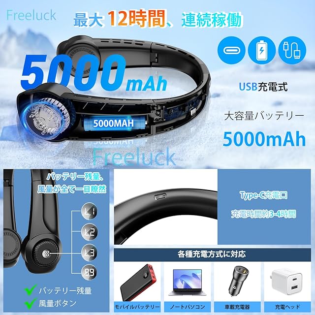【5000mAh大容量バッテリー&LEDバッテリー残量表示】5000 mAh充電池を内蔵し、4~12時間連続運転が可能(風速によって変化する)。このネックファンは急速充電設計を採用しており、わずか3時間で充電でき、1日で強い気流を楽しむことができます。ネッククーラーは従来のネックファンとは異なるデザインを採用しており、ネックファンにLED表示が追加されたことで革新的なアイデアがあります。1~3つの風度とバッテリ残量を表示し、風速の調整やバッテリ残量の表示を容易にし、一日中涼しい空気の流れを楽しむことができます。