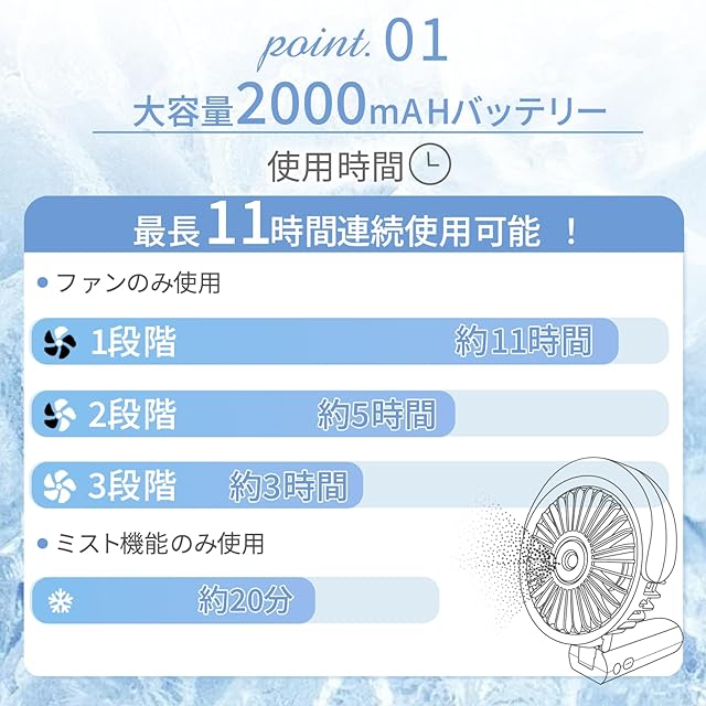【大容量2000mAHバッテリー】 最長11時間連続使用可能! 風とミストで、心地よい時間。 スポーツ観戦や屋外作業、猛将日のお出かけにとって欠かせない一品! 様々なシーン大活躍!