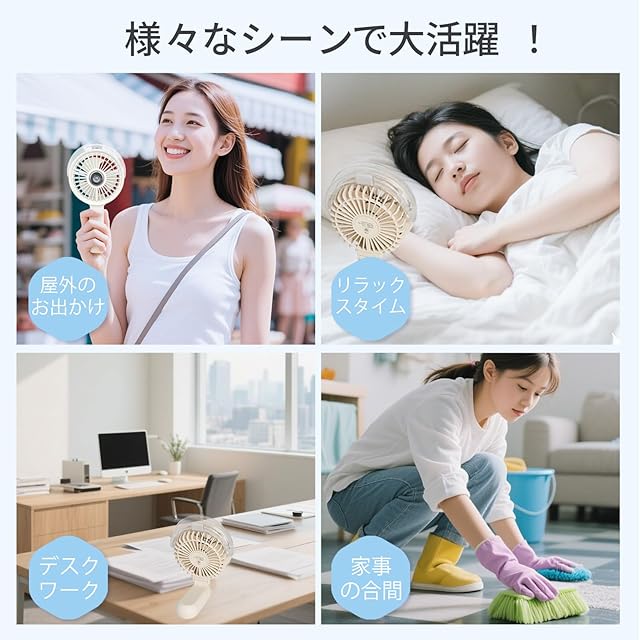 【折り畳めるデザイン】 卓上ファンとしても大活躍! 折りたたみ式だから、省スペースで使いやすい。 お仕事やゲームのお供に、涼しいひとときを。