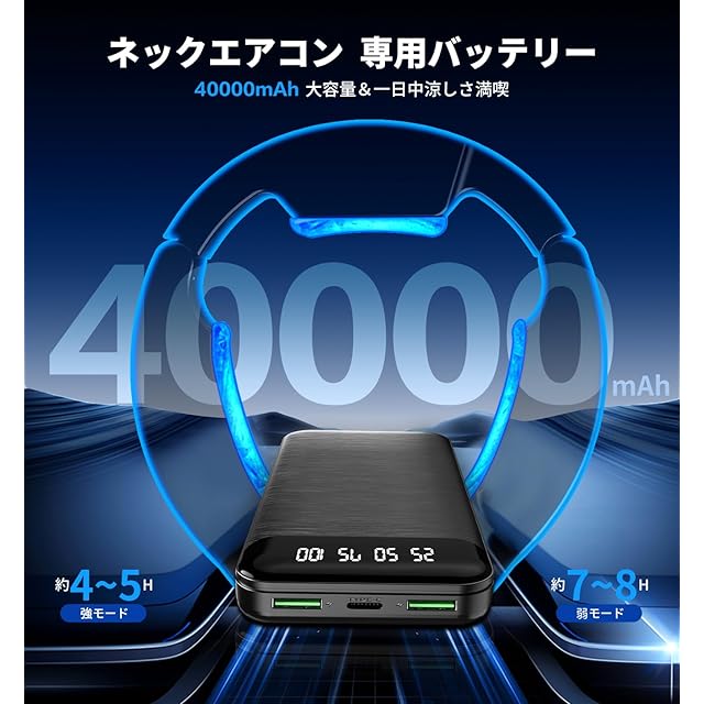 【40000mAh大容量バッテリーセット・強弱モード切替】軽量設計のため、USB Type-C給電式に進化しております。5V 2.2A以上仕様のアダプター・モバイルバッテリーに接続して稼働します。(※バッテリー内蔵なしで、充電式ではありません。バッテリーは別売です) 強モード:外気温より最大-17℃冷やす 、稼働時間約3H。弱モード:外気温より最大-13℃冷やす 、稼働時間約4H。(稼働時間は10000mAhのモバイルバッテリーを利用する場合測定したものです。)軽量&コンパクトで収納しやすく、携帯性に優れているのでカバンなどに入れて持ち運び便利です。炎天下の作業・通勤・通学・アウトドア・運動・散歩・山登り・BBQ・花火大会などあらゆる場面で活躍するアイテムです。