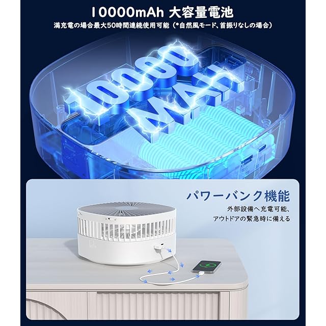 「10000mAh大容量電池・パワーバンク機能搭載」 扇風機に10000mAhの電池が内蔵され、満充電時間は約8時間かかり、一度満充電して9時間以上、最大50時間連続使用可能です。USB充電式で、コードレス使用でき、使用場所に制限がなく、在宅の使用はもちろん、アウトドアの使用も可能です。ベースには給電用と充電用の2つのポートがあり、TYPE-Cポートは付属のケーブルに繋いて扇風機の充電をします。USBポートは外部設備へ給電用のポートになり、スマホ、タブレット又は他の電気設備の電源として使えます。ピクニック、キャンプなどのアウトドアの場合、緊急事態に備えて、パワーバンク機能があれば大変助かります。