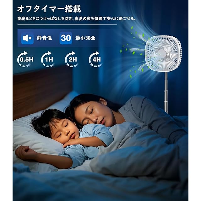「省スペース・静音」 ヘッドとベースとは7段階伸縮できるロッドより繋げられ、直径20.5cm*高さ11.4cmまで収められる折り畳み式デザインで、使用しない場合は簡単に収納でき、あまりスペースを占めません。騒音値は最大でも70db以下になり、昼間の使用では気になるほどの音は出さず、夜にもストレスなく涼しく過ごせます。