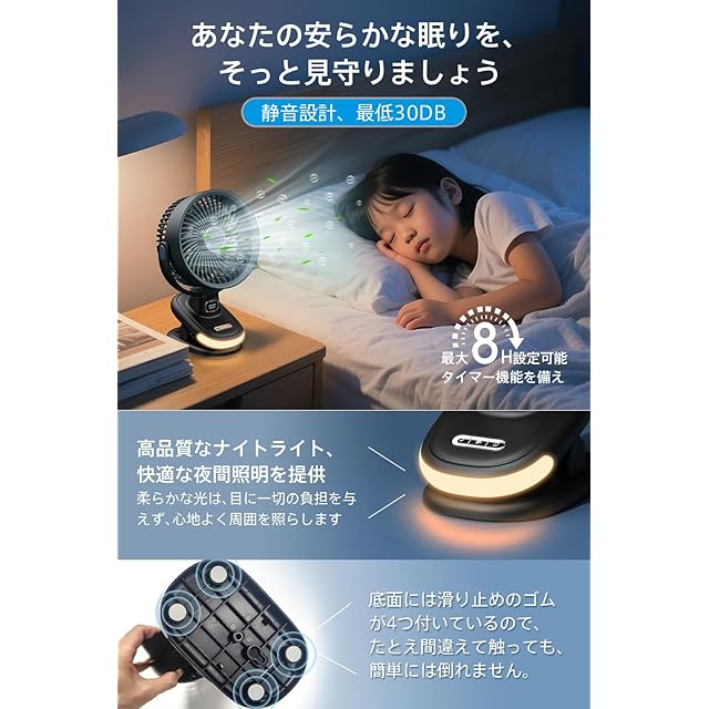 【3D首振り&タイマー&ナイトライト!自由自在な操作性】首振りボタンをクリックで左右首振り機能をオン/オフ。振り角度は左右70度で広範囲に涼しい風を送ります。手動で上下最大±90度の角度調整が可能。自分好みの風向きに調整でき、快適な涼しさを実現。タイマー機能(2時間/4時間/8時間の定時オフ)長時間ファンを運転させる必要がない場合、タイマー機能で設定時間後に自動で停止。省エネで長寿命をサポート。ナイトライト機能(独立操作)電源ボタンをダブルクリックしてナイトライトをオン/オフ。夜間照明として使用可能。柔らかい光量で目に優しく、就寝時や暗い場所でも安心。
