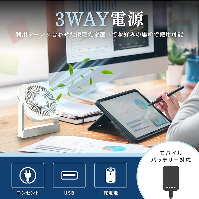 【卓上扇風機】コンパクトデザインで収納にも便利な、どこでもFANTASTICの3WAY電源の卓上扇風機。洗面台・トイレ・オフィスはもちろん、アウトドアでもお使いいただけます。