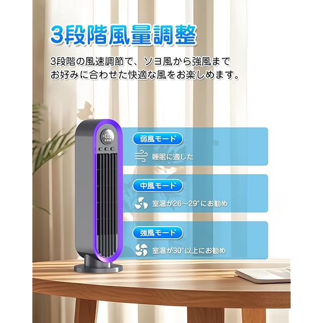 【2025新登場・風量ハイパワー・卓上扇風機】こちらのタワーファンにはハイパワーDCモーターが搭載されており、ブレードレス設計により強力で安定した静かな気流が得られます。ふわりとした微風からビューンと遠くに届く強風まで室内の空気循環を促進し、広範囲に風を届け、非常にパワフルな送風性能。高機能&高性能なリビングファンで、暑い時期をもっと快適に。