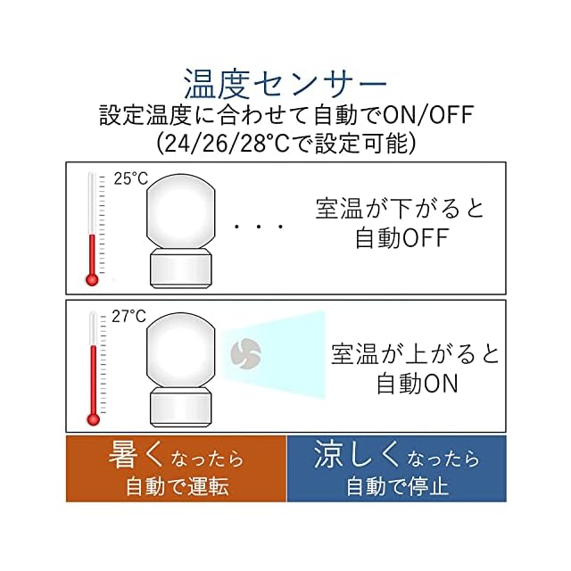 【温度センサー】設定した温度に合わせて自動で運転/停止する温度センサー機能。無駄な運転を防ぎ、省エネにも繋がります。温度は24/26/28℃で設定が可能です。