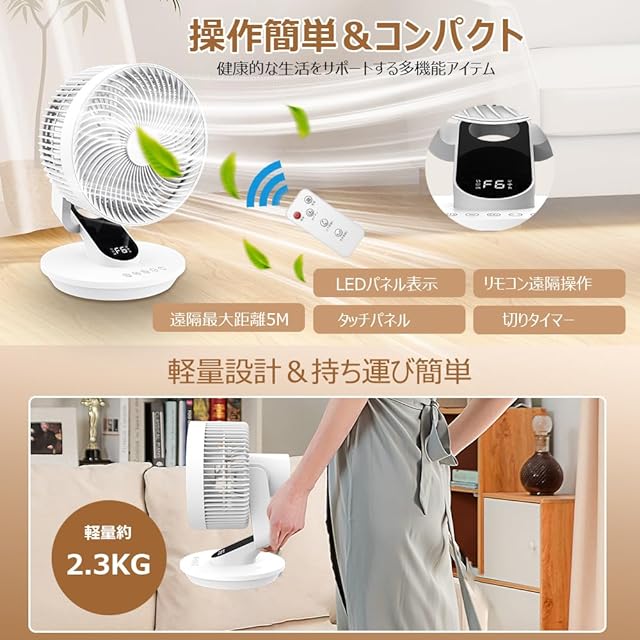 ♥【パッケージ内容·品質保証】製品仕様:重量:約2.3kg、適用床面積(目安):30畳、コード長さ:約1.5M、パッケージ内容:サーキュレーター、リモコン、取扱説明書。製品は約2.3kgの軽量設計で、片手で簡単に持ち運び可能!リビングから寝室まで、思いのままに移動できます。快適さと便利さを両立しよう!PSE認証取得厳格検査を通過した高品質扇風機です。万が一製品に不具合が生じた場合やご不明点がございましたら、ご連絡いただければ、修理や交換など、最善を尽くして対応させていただきます。お客様に安心してお使いいただけるよう、万全のサポート体制を整えております。