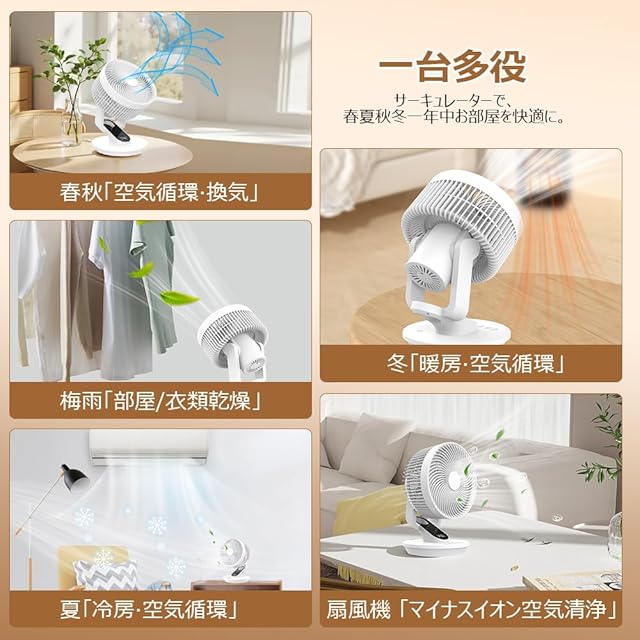 ♥【2025日本初登場 サーキュレーター·4Dランダム送風·強力な風量·広範囲送風】2025年新登場 のサーキュレーターは、健康的な生活をサポートする多機能アイテム!夏は涼しい風を届ける扇風機として、春や梅雨時には換気や衣類乾燥、空気循環に大活躍。1台で年間を通じて便利に使える万能設計です。サーキュレーターは、強力なモーターを搭載しており、パワフルな風量で部屋全体に風を送り出します。特殊設計により、最大で30畳の広範囲に風を届け、最大距離約28m先まで届く強力な送風を実現します。効率的な空気循環を実現します。(除湿機、加湿器、エアコン、暖房器具はサーキュレーターとの併用でそれぞれの効果がアップ!直進性の強い竜巻風が部屋中に空気の流れを作り、部屋全体の空気をやわらかく循環します。)