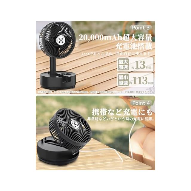 【超大容量20,000mAh充電池搭載】電源コードを気にすることなく、コンセントがない場所でも使用することができるコードレスリビング扇風機です。超大容量20,000mAhのリチウムイオンポリマー電池を内蔵しています。フル充電の場合、最小モードで約113時間の連続使用ができます。最大モードでも約13時間の連続使用が可能です。また、独自の羽根形状で、コンパクトサイズでありながらも効率よく風を送り、パワフルな風を発生します。