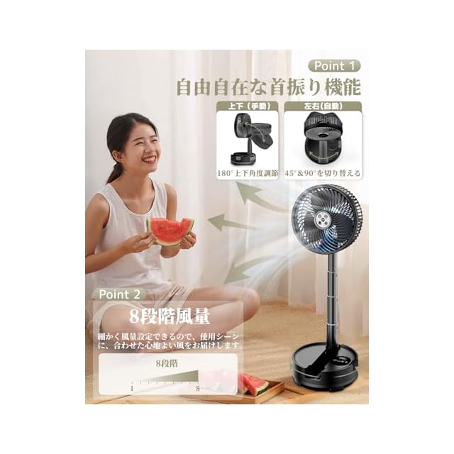 【左右自動首振り&オフタイマー】他社のアウトドア扇風機の多くは、軽さを追求したことで簡易化され、送風の向きなどを変えることはできず、本体ごと動かす必要がありました。AMZHOOZの折りたたみ式扇風機は左右自動首振り角度を45°&90°を調節することが可能です。手動で上下角度調節もできて、お好みの角度から涼風を送ることができます。また、1H/2H/4H/8Hのオフタイマー搭載し、設定時間に合わせて自動で電源OFFになるので、就寝時・外出時などの消し忘れを防ぎます。