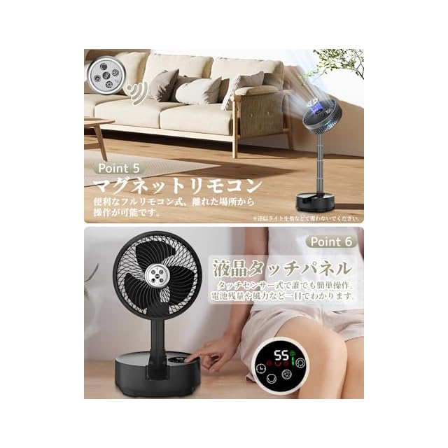 【リモコン操作&液晶タッチパネル搭載】リモコンで遠隔操作が可能です。離れた場所にいても寛いだ姿勢のまま全ての操作が可能です。扇風機の操作盤は軽く触れるだけで操作できるタッチパネル方式を採用。また、液晶画面で電池残量や風力など一目でわかります。