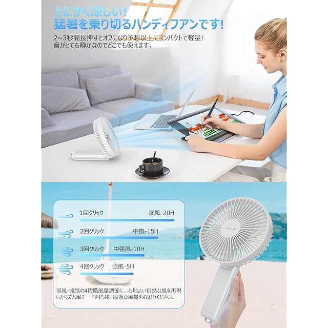 【4段階風量切替&5枚羽根&流線型設計】折りたたみ扇風機は弱・中・強・超強の4段階の風量調節機能が搭載、風量切替ボタンを押すたびに、自然に近い優しい風からパワフルな風まできめ細かく風量を調節することが可能。室内では1~3段目の自然風と微風と弱風モードで優しく自然風を再現し、超静音で職場や図書館でも快適に過ごせます。夏場の野外では4段目の超強風でパワフル送風し、猛暑でもより爽やかな涼感をもたらします。従来品と比べ、弊社の手持ち扇風機は5枚羽根を採用、羽根全体を流線型デザインにすることで、羽根の中心を効率的に活用して風を集めます。空気抵抗を減らすことで、風速の変動幅が小さく、バランスのとれたなめらかな風を生み出します。