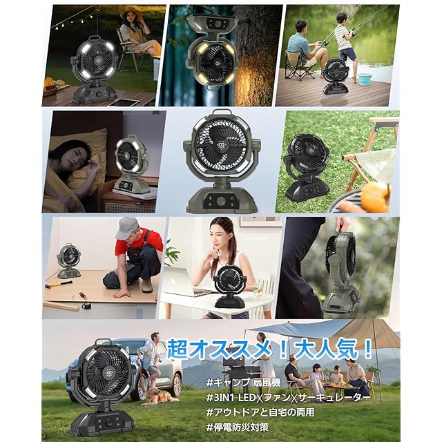 【DCモーター搭載で静音・省エネを実現】アウトドア扇風機は三相DCブラシレスモーターにより、コンパクトサイズでありながらも効率的に風を送り、想像を超える大風量を実現!高効率・静音・長寿命・省エネを実現!消費電力はわずか約15W!ACモーターでは実現できなかった、圧倒的な省工ネ性能です。人と環境に優しい充電式扇風機!車中泊卓上充電式ファンは静音設計で、ぐっすり眠れる静かさと心地よさを提供、心も身体もすっきりリフレッシュできます。