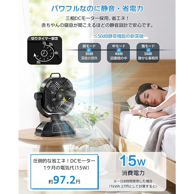 【DCモーター搭載で静音・省エネを実現】キャンプ 扇風機は三相DCブラシレスモーターにより、コンパクトサイズでありながらも効率的に風を送り、想像を超える大風量を実現!高効率・静音・長寿命・省エネを実現!消費電力はわずか約15W!ACモーターでは実現できなかった、圧倒的な省工ネ性能です。人と環境に優しい充電式扇風機!車中泊キャンプ扇風機は静音設計で、ぐっすり眠れる静かさと心地よさを提供、心も身体もすっきりリフレッシュできます。