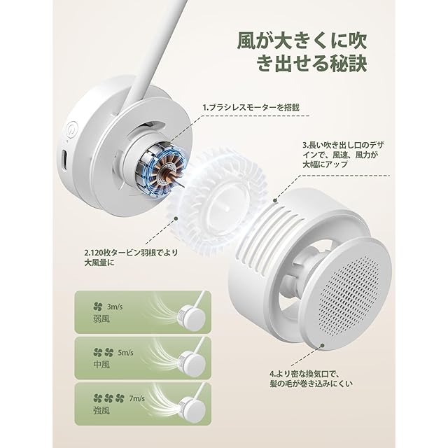 【安全性拔群&低騒音】羽根を隠したデザインを採用したネックファンは、髪の毛の巻き込みを気になりません。シリコン素材で肌に直接触れるネックバンド部分には、やわらかな感触で首にやさしくフィットすることができます。肌に触れる面積を最小限にし、密着することで生じる汗やムレなどの不快感を最低限に抑えています。場所を問わず使えるように、ミニ扇風機が独自の低騒音化技術により、驚くほどの静音性(25dB)を実現、シーンを問わず使いやすい。