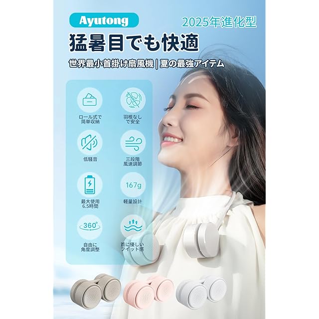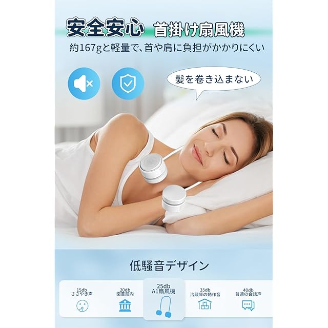 【2025夏新登場&折り畳み首掛け扇風機】弊店のネックバンドファンは人間工学に基づいたデザインで、わずか167gの超軽量、最新の負荷軽減構造設計、従来版(通常版ネックファン)より約100g軽量化、長時間使用しても肩や首に負担がかからない。 ダブルブレードレス送風方式で、羽根付きせんぷうきと別れて、髪が引っ掛かったり、異物を挟み込む事をご心配なく。安全性を重視する設計で、指が入る隙間もないので、年齢問わず安全に使えます。貴方の両手自由に猛暑も余裕で過ごせましょう。