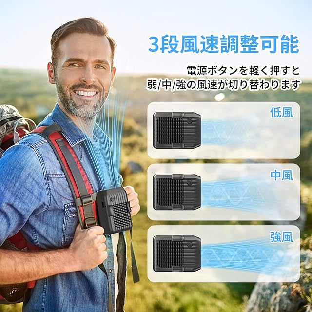 【3段階風力調節可能&風向き調整可能】 腰かけ扇風機の風量は弱、中、強の3段階で調節が可能、電源スイッチを一回軽く押すと弱風モード、二回を押す中風モード、三回押すと強風モードになります。高品質ベルトファン、わずか210gの超軽量。