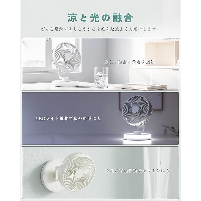 【1台3役&四季通用】✅この扇風機は1台で3つの用途を兼ね備えています。デスクトップに置いて使うことも、壁掛けとして使用することも、さらには小夜灯としても活躍します。夏はエアコンと併用すればさらに省エネ効果を発揮し、冬は暖房と一緒に使うことで室内の温かい空気を循環させます。春秋には空気の循環を促し、梅雨の時期には湿気を取り除き、衣類を乾燥させることもできます。四季を通じて便利に使える多機能小型扇風機です。