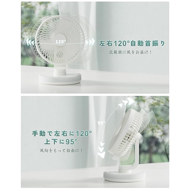 【自動首振り&静音設計】✅左右120°の自動首振り機能を搭載しており、頻繁に手動で位置を調整する手間が省けます。また、上下95°および左右120°の手動調節が可能で、座っている姿勢や寝転んでいる姿勢に合わせて、風を快適な位置に送ることができます。(✨電源を切ると首振りの位置が正面に戻るのが便利です。)高性能DCモーターを採用しており、弱風モードではほとんど音がせず、涼しい風を楽しみながら騒音に邪魔されることがありません。(✨ユーザー100%が実感!今まで使った扇風機の中で最高レベルの静音性を実現。)