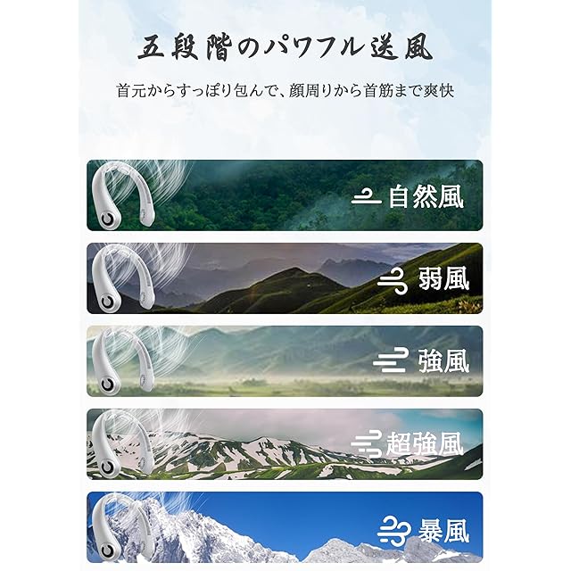 【5段階調節可能・熱中症対策】 首掛け扇風機は5段階の風量調節が可能で、異なる使用シーンのニーズを考慮し、それぞれの風量の快適性と安定性を確保しているため、さまざまな環境で最適な風量を見つけ、いつでもどこでも涼しさを楽しむことができます。軽い風で、静かな室内環境、例えばオフィスなどでの使用に適して、他人を邪魔せずに涼しさを楽しむことができます。最も強い暴風で、極端な高温や激しい運動後の迅速な冷却が必要な状況に最適で、短時間で涼しさを回復します。ネッククーラーの5段階風量調節機能は柔らかい微風から強い涼風まで、ボタンを軽く押すだけで簡単に切り替えることができます。さらに、この首掛けファンの風量調節は単なる風速の調整ではなく、風の均一性と安定性も考慮されており、各風量が快適な使用感をもたらすことを確保しています。