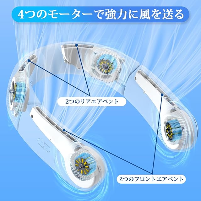 【四つ強力ファン】業界初の四つのターボファンを搭載した設計を採用し、総計320枚のファンブレードが風を集めて、従来ネックファンと比べ、最大100%以上の風量向上を実現し、想像以上の風力を発揮。超高速四駆モーターを搭載し、内蔵された拡大版ファンブレードを回転させることで強力な風を送ることができます。新しいアラウンド上下送風路設計は、従来の左右の風路に比べ、風量の進化が6倍以上と圧倒的です。