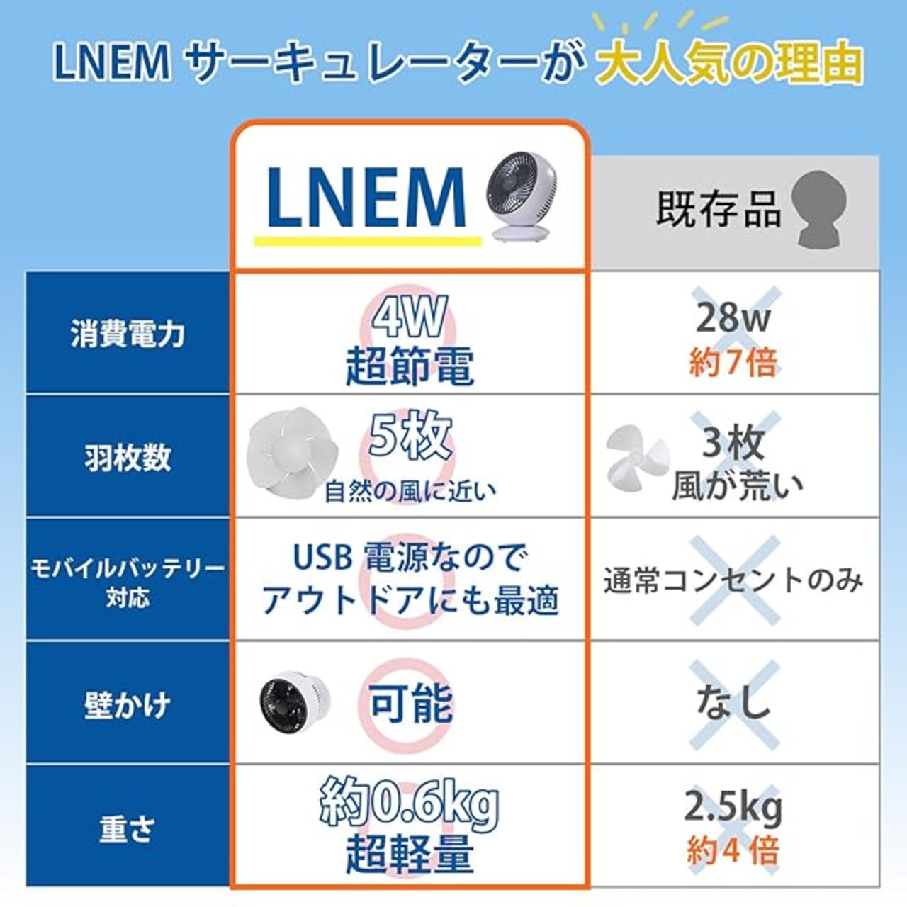 【究極の省エネモデル】LNEMサーキュレーターの最大消費電力は4W,静モードはなんと2Wとなり、人気サーキュレーターメーカーのなんと1/10。他社の28Wのサーキュレーターを1日20時間付けると、毎月660円ぐらいの電気代が発生しますが、弊社のサーキュレーターなら約100円しか発生しません。 一人暮らしやエアコンを効率的に使いたい人に最適(ご注意:実際の電気代は、外の気温、エアコンの出力使用スペースの広さ、電力会社の料金などの要因によって異なる場合があります。)