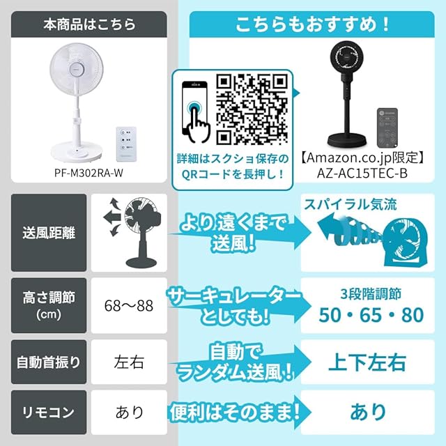 風量調節:3段階(弱/中/強)、高さ調節:約68~88cm、切タイマー:30/60/90/120/150/180min、首振り:○