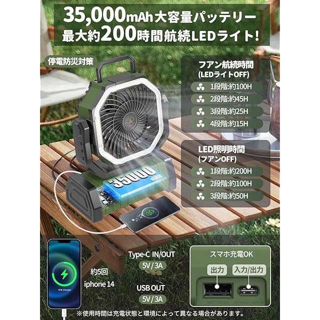 【35,000mAh大容量・LEDライト付き扇風機】35,000mAh大容量リチウムイオンポリマー電池を内蔵したコードレス扇風機はファンで最大100時間、LEDライトで最大200時間の航続が可能です。1回の充電で15時間ほど稼働ができるので長時間の使用でも安心。また、キャンプ扇風機は5V3A出力のType-cポートも装備しており、携帯電話の充電にも対応し、モバイルバッテリーとして使用もOKです。さらに、LEDライト機能付きなので、災害時やキャンプの夜など明かりが必要なシーンでも役立ちます。
