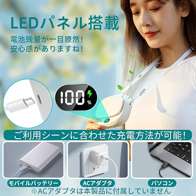 【1台4役多機能扇風機】「首掛け扇風機」ネックストラップ付き、上部送風で首にかければマスクつけていても、顔がさっぱり!「腰掛け扇風機」:本体の裏側にクリップ付き、ベルトに付けるだけ、服内に循環送風!「卓上扇風機」:本体のスタンドを付ければオフィスなどデスクの上でもひんやり。「手持ち扇風機」:いつでもどこでも爽やかに!携帯扇風機は手持ち・卓上・折り畳み・首掛け扇風機との4タイプ機能を同時に備え、4in1なモデルが来年の夏でもあなたの好み味方.