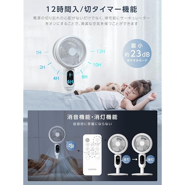 【12時間入/切タイマー機能・静音】12時間の入/切タイマー機能は忙しい生活の中で手間を省けます。設定した時間にサーキュレーターが自動的にON/OFFするので、時間と電気代を節約できます。おやすみモードでは、わずか23dBの静音設計で、夜間も安心してお休みいただけます。リモコンでパネルの消灯や運転音の静音も可能です。より快適な睡眠環境を作り、健康な睡眠に全面的なサポートを提供します。