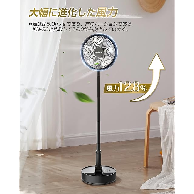 折りたたみ&伸縮自在:38cmから102cmまで自在に高さ調節が可能。コンパクトに折りたたんで収納でき、限られたスペースでの使用にも適しています。室内はもちろん、アウトドアにも最適な多機能リビング扇風機です。