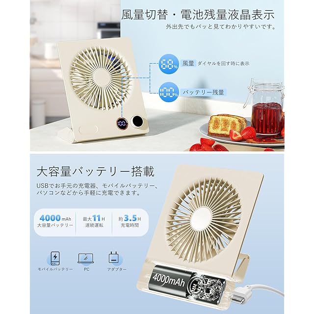 【風量/電池残量表示&安全設計】風量と電池の残量が1%刻みでデジタル表示されひと目で分かるようになっています。外出先でもパッと見てわかりやすく、充電するタイミングを判断しやすくて安心してご使用いただけます。ファンに触れないようカバーは目が細かいので指が入りにくいです。優れたABS樹脂で作られているので、対衝撃性に強く紫外線に対して変形しにくく耐久性を持っています。【セット内容】卓上扇風機本体、リモコン、タイプCケーブル、日本語取扱説明書。