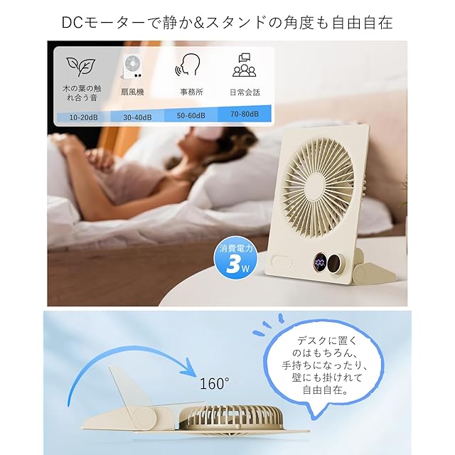 【風量無段階調節&160°角度調節】やさしい微風から強風まで無段階で自由自在。風量は右に回すと強く、左に回すと弱くなり、液晶画面で強弱がわかりやすく表示されます。少ない電力でパワフルな風を生み出すDCモーターを搭載。小さいけどしっかり涼めて、節電にもつながります。上下160°角度調節が可能。使用場所やシーンによってお好みの角度を調節できます。