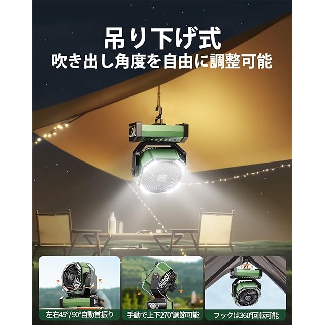 【頑丈な材質・切タイマー機能】このキャンプ 扇風機は頑丈で耐久性のある構造を採用し、落下や衝突を防ぐことができ、頑丈な台座は強力な安定性を提供し、サーキュレーターをしっかり固定させる。この扇風機は、あずまや、庭、キャンプ、遠足、ピクニック、釣り、ボートなどのアウトドア扇風機に最適です。素晴らしいキャンプの必需品、テントのキャンプ扇風機。室内での使用、学習、仕事、読書などにも適しています。※また、消し忘れ防止に切タイマー機能で、1・2・4・8時間が設定できます。就寝中の身体お冷やしすぎを防ぎます。USB充電式かつ20,000大容量バッテリーが内蔵、外出時でも長時間使用できます。