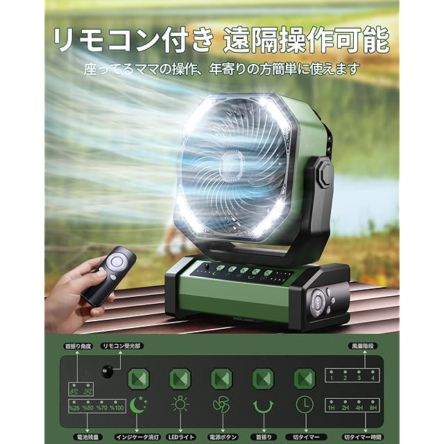 【静音・便利なリモコン付き】このキャンプ 扇風機は、最も低い ノイズ (<50db) で動作し、寝室、寮の部屋、オフィスなどの卓上扇風機として最適です。スリープ モードが有効になっている場合、睡眠を妨げることなくすべてのインジケータ ライトがオフになります。 暑い夏に冷房と照明を提供する理想的な寮の部屋の必需品。また、キャンプ 扇風機の側にリモコンをピッタと収納でき、行方不明の悩みを解決!※リモコンを使用する前に、絶縁シートを引き抜いてご使用ください。