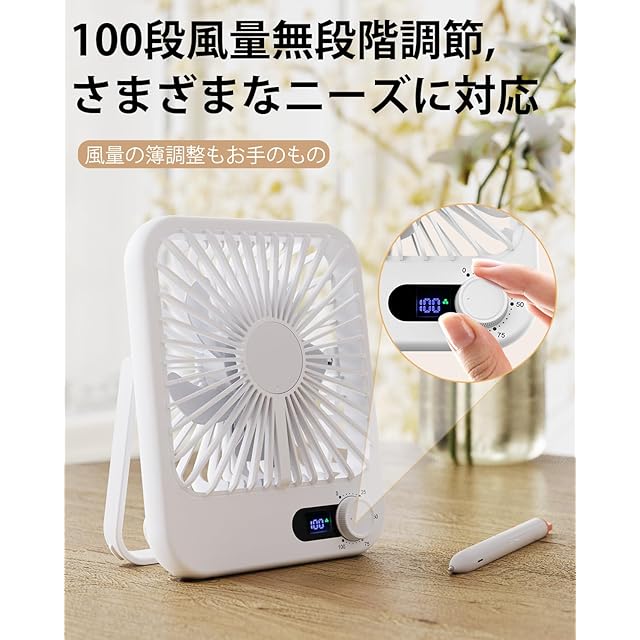 【無段階風量調節&LCD電池残量表示】スイッチは1つだけ、簡単で風量を調節することができます。スイッチを回すだけで、風量が0から100段階まで順番に変化し、気温に応じて異なる風力を調節できます。ファンにはデジタル表示画面があり,現在の風速とバッテリ電力量を表示でき,残電力量の追跡に便利である。