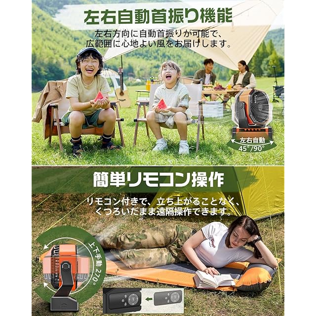 ❆彡【どこでも自由に使えるコードレス扇風機】 コードレスでどこでも自由に持ち運びができる、左右の自動首振り機能付きの充電式扇風機です。リモコンで遠隔操作が可能です。立ち上がることなく、くつろいだまま操作できます。コンパクトな設計で、アウトドアはもちろん、ベランダ、ガーデニングやキッチン、屋外作業など、コンセントの位置を気にせず、様々なシーンで大活躍します。