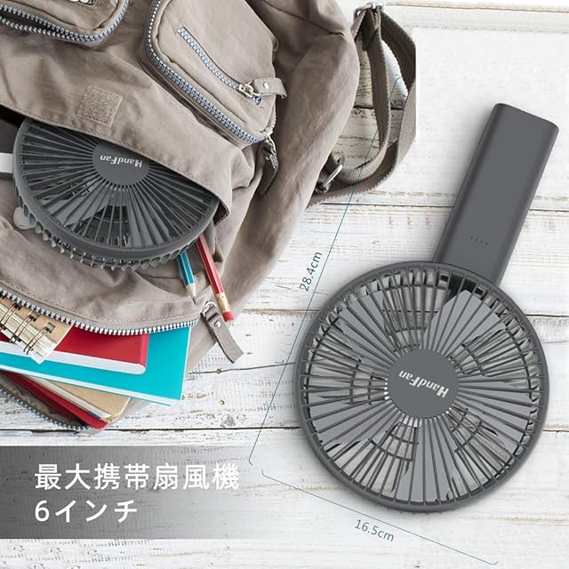 【うわ~大きなハンディファン!】直径16.5㎝の携帯扇風機を見たことがありますか?市販の携帯扇風機と比べて、サイズ感がちょっと大きに見えるが、5枚羽根を採用して、自然に近いスムーズからパワフルまでの風量を達成して、合わせて6段階の風量を調整可能。電量100%の場合には、自然風モードで34時間を稼動できる、強風のモードで5時間を稼動できる。長押しでオフと使いやすい,スマートに操作できる。自分の好みで心地良い風を楽しましょう。更年期のホットフラッシュとの症状によって困っている方にもおすすめです。充電するとずっと使える、すぐホットフラッシュを落ち着かせる作用も期待できます。強力風量が持っているので、サーキュレーターとしてエアコンなどと併用することをおすすめ。